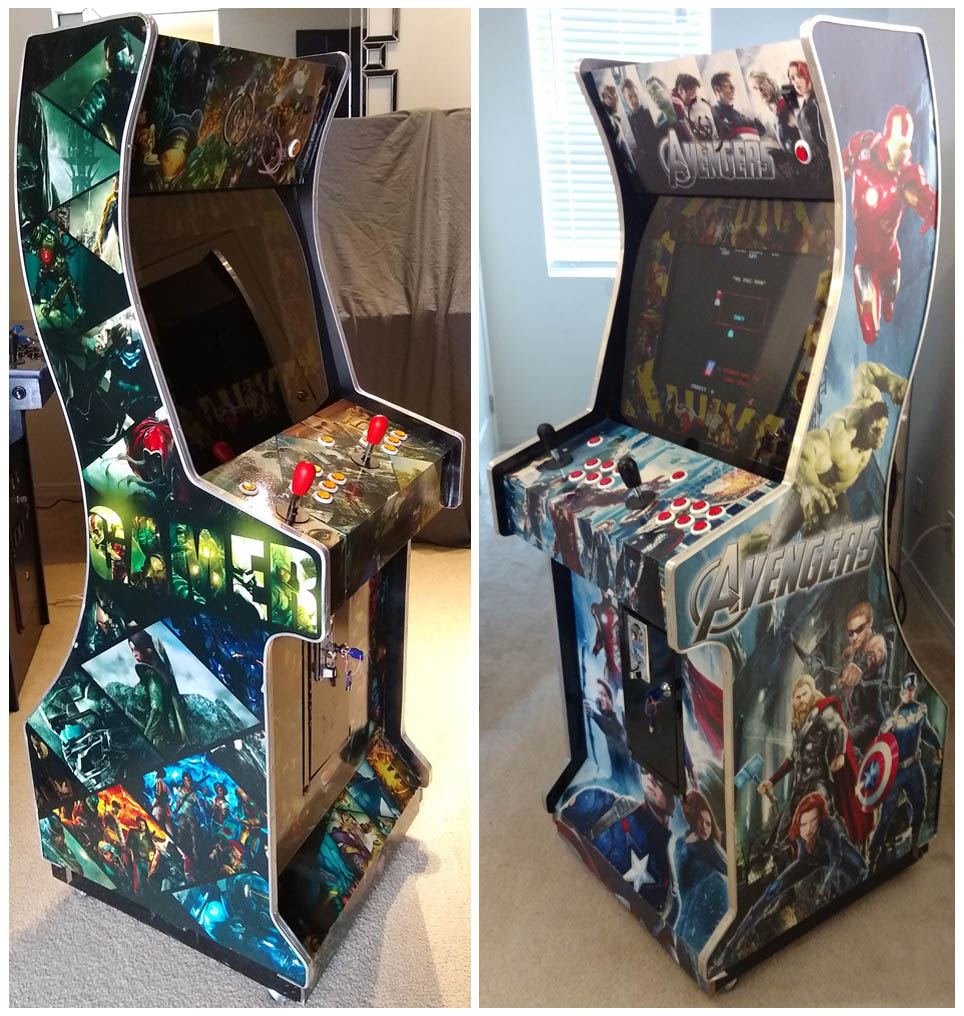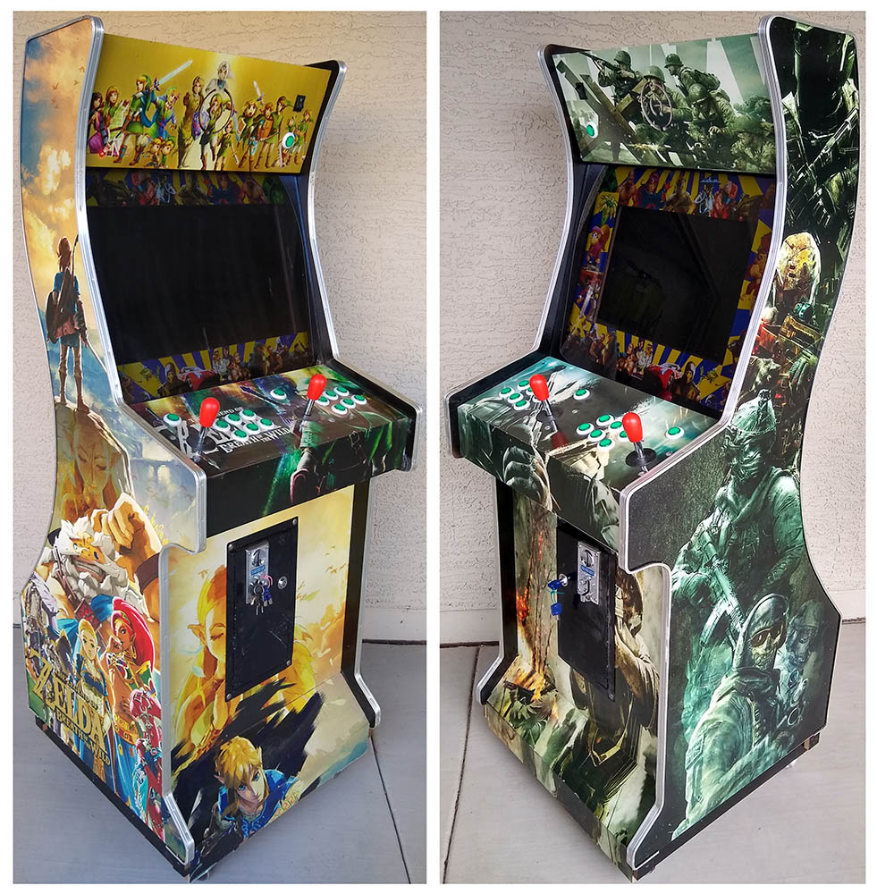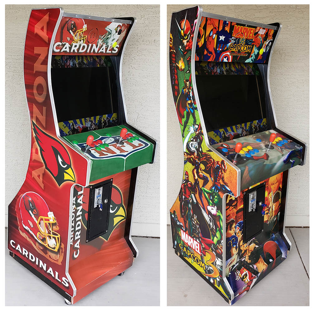 Screen sizes are between 19″ to 24″ flat screens. On average, these will weigh about 100 lbs. They come with keys for the coin box and rear entry panels.